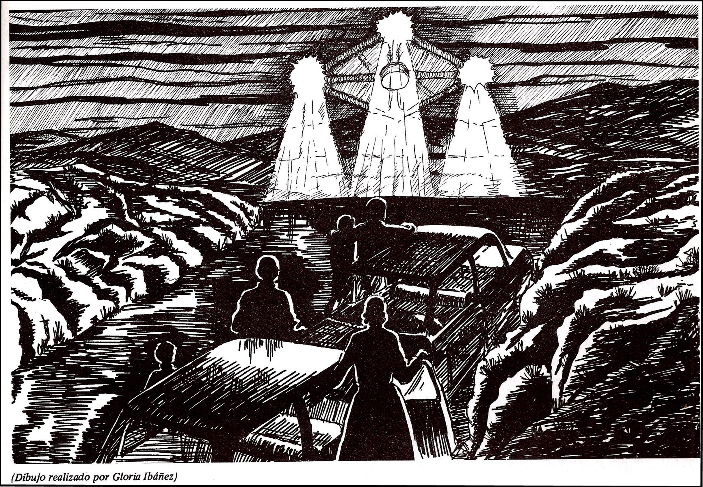 Mi padre y su amigo se bajaron del coche, mi madre nos abrazó a mi hermano y a mí, y empezó a rezar, mi obsesión era que mi padre se metiera en el coche porque pensaba que le iban a hacer algo. Esa luz tan inmensa se puso encima de nosotros, estuvo un buen rato, pero no hacía nada de ruido, no se oía nada a pesar de que la teníamos a solo unos metros, estaba muy baja, en el centro tenía como un circulo que hacía como si fuera un juego de luces.