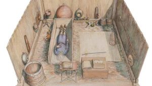 Reproducción de la tumba encontrada en Prittlewell (AFP). Contenía al menos 40 artefactos incluidos valiosos objetos de reinos extranjeros.