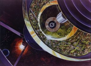 Lo que vemos en estos dibujos son esos tres modelos que hemos citado antes, que muestran distintas formas y disposiciones de los hábitats. La cilíndrica muestra estructuras en una gran estructura espacial en forma de panal, siguiendo la teoría del Cilindro del mismo O’Neill, la esfera de Bernal es homónima al planteamiento de colonia en un asteroide hueco del físico, y quizás la que más nos suene en cierto modo es la del toroide, ya que esa forma ha sido recurrente en arte y ciencia ficción.